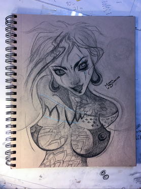 Various charcoal, acrylic paint, pen, and pencil artwork.